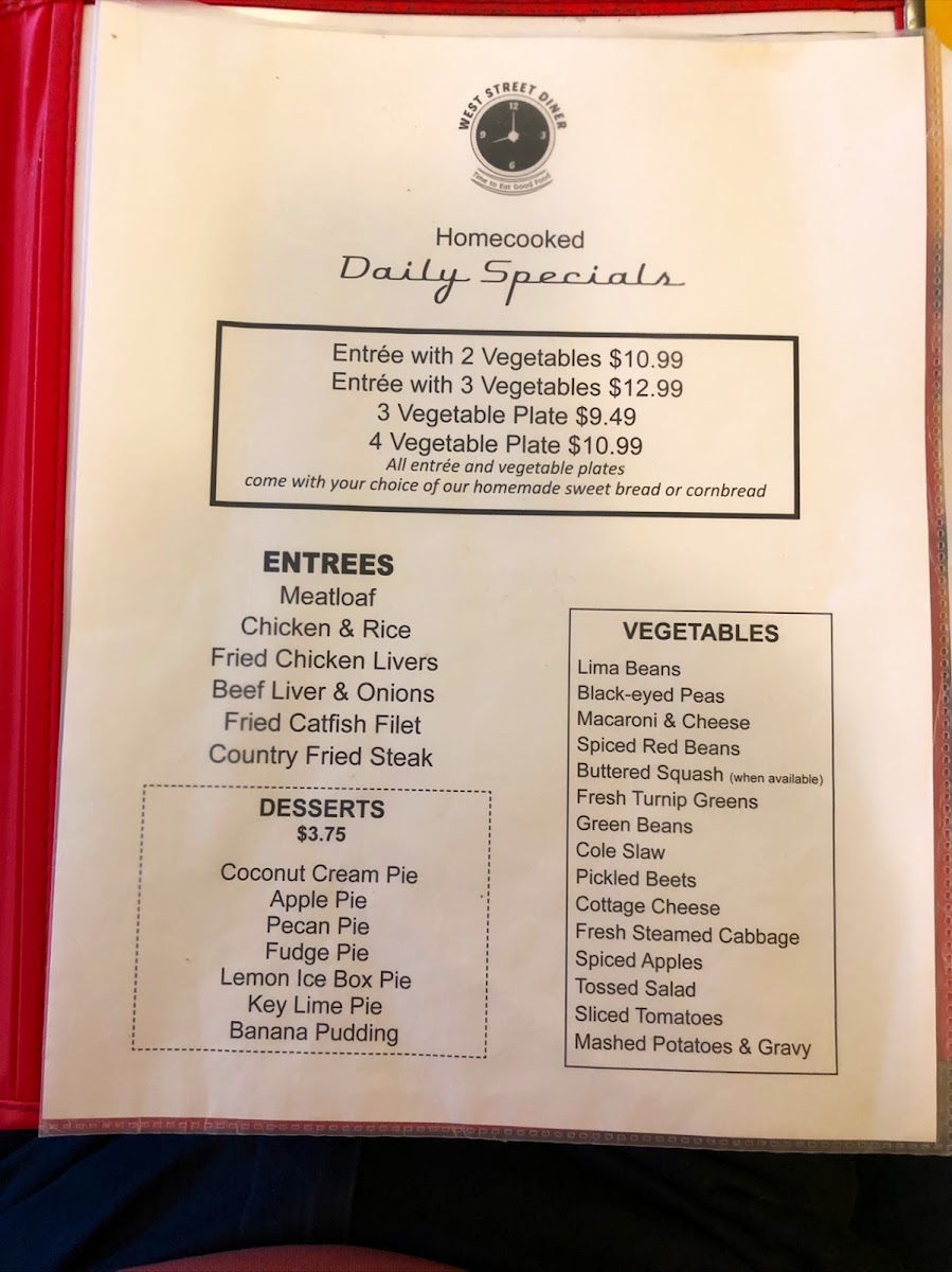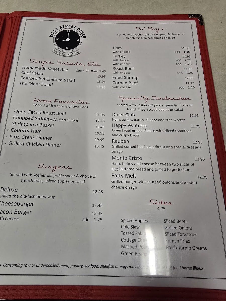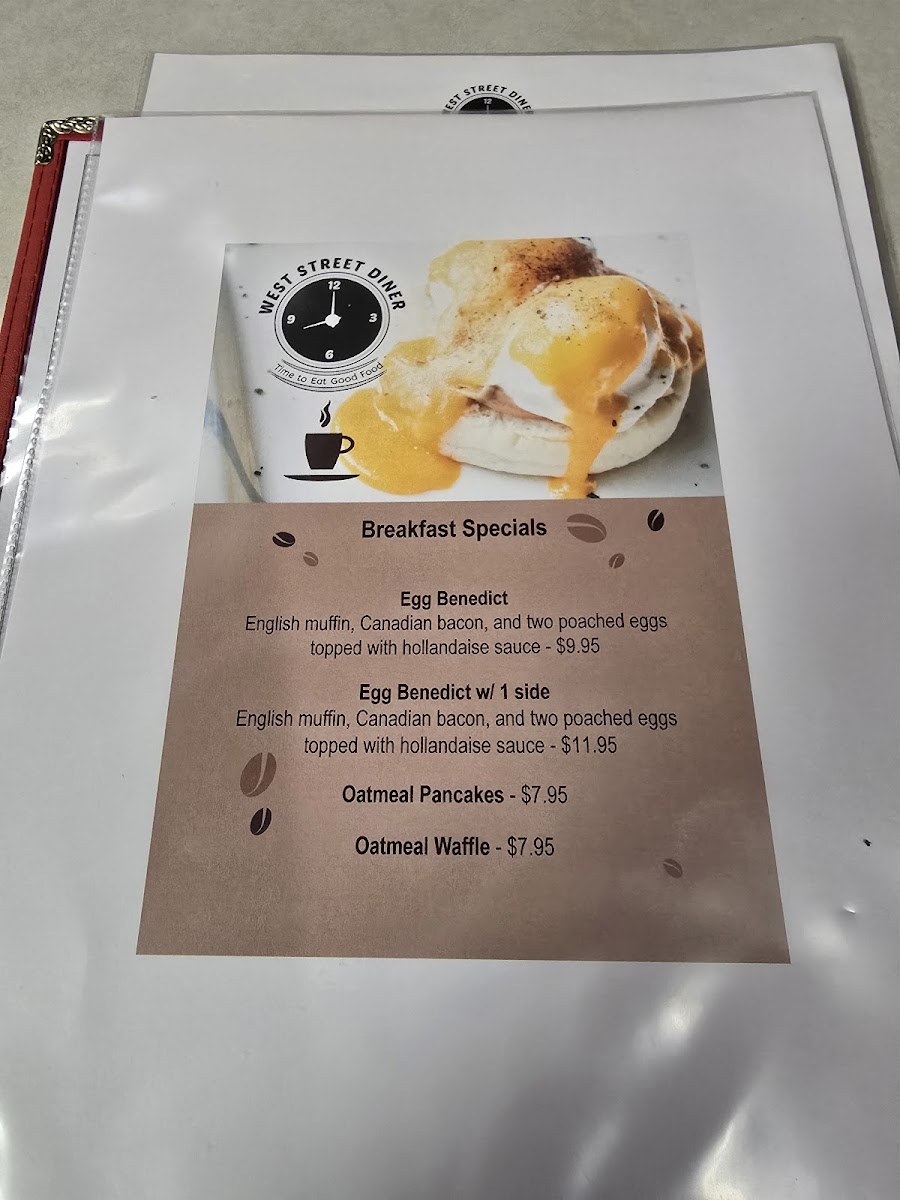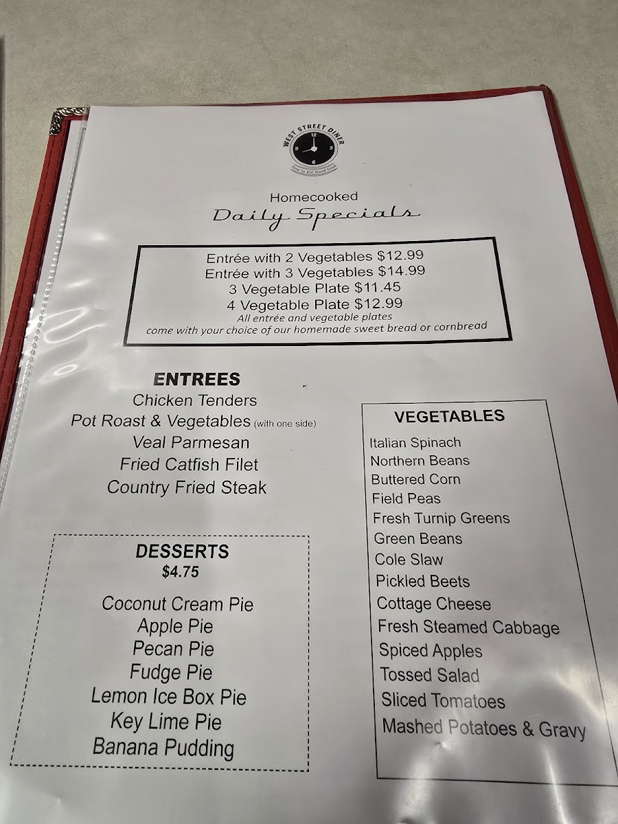 The West Street Diner menu embraces a straightforward, comforting approach that reflects its casual, welcoming atmosphere. From hearty breakfasts like the Western Omelette and Steak & Eggs served any style, to classic southern plates such as Country Fried Steak and Chicken and Dumplings, the offerings feel like a home-cooked meal made with care.